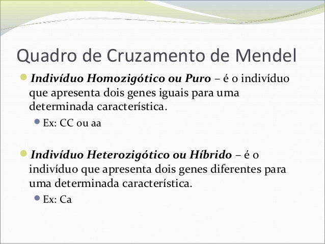 18. 18. Quadro de Cruzamento de MendelIndivíduo Homozigótico ou Puro – é o indivíduo que apresenta dois genes iguais para uma determinada característica. Ex: CC ou aaIndivíduo Heterozigótico ou Híbrido – é o indivíduo que apresenta dois genes diferentes para uma determinada característica. Ex: Ca