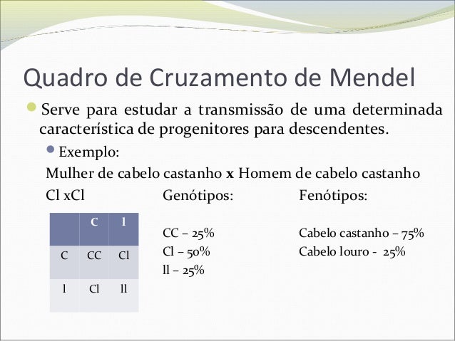 19. 19. Quadro de Cruzamento de MendelServe para estudar a transmissão de uma determinada característica de progenitores para descendentes. Exemplo: Mulher de cabelo castanho x Homem de cabelo castanho Cl xCl Genótipos: Fenótipos: C l CC – 25% Cabelo castanho – 75% C CC Cl Cl – 50% Cabelo louro - 25% ll – 25% l Cl ll