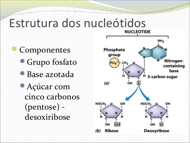 4. 4. Estrutura dos nucleótidosComponentes Grupo fosfato Base azotada Açúcar com cinco carbonos (pentose) - desoxiribose