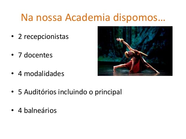 Na nossa Academia dispomos…• 2 recepcionistas• 7 docentes• 4 modalidades• 5 Auditórios incluindo o principal• 4 balneários