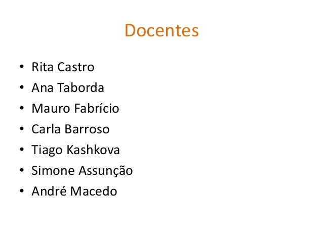 Docentes• Rita Castro• Ana Taborda• Mauro Fabrício• Carla Barroso• Tiago Kashkova• Simone Assunção• André Macedo