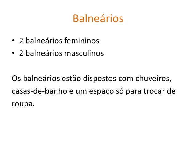 Balneários• 2 balneários femininos• 2 balneários masculinosOs balneários estão dispostos com chuveiros,casas-de-banho e um...