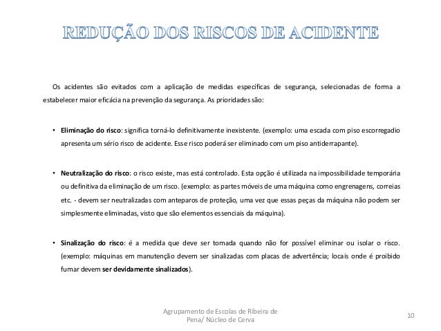 10. 10. Os acidentes são evitados com a aplicação de medidas específicas de segurança, selecionadas de forma aestabelecer maior eficácia na prevenção da segurança. As prioridades são: • Eliminação do risco: significa torná-lo definitivamente inexistente. (exemplo: uma escada com piso escorregadio apresenta um sério risco de acidente. Esse risco poderá ser eliminado com um piso antiderrapante). • Neutralização do risco: o risco existe, mas está controlado. Esta opção é utilizada na impossibilidade temporária ou definitiva da eliminação de um risco. (exemplo: as partes móveis de uma máquina como engrenagens, correias etc. - devem ser neutralizadas com anteparos de proteção, uma vez que essas peças da máquina não podem ser simplesmente eliminadas, visto que são elementos essenciais da máquina). • Sinalização do risco: é a medida que deve ser tomada quando não for possível eliminar ou isolar o risco. (exemplo: máquinas em manutenção devem ser sinalizadas com placas de advertência; locais onde é proibido fumar devem ser devidamente sinalizados). Agrupamento de Escolas de Ribeira de 10 Pena/ Núcleo de Cerva