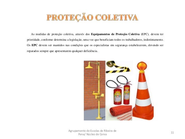 11. 11. As medidas de proteção coletiva, através dos Equipamentos de Proteção Coletiva (EPC), devem terprioridade, conforme determina a legislação, uma vez que beneficiam todos os trabalhadores, indistintamente.Os EPC devem ser mantidos nas condições que os especialistas em segurança estabelecerem, devendo serreparados sempre que apresentarem qualquer deficiência. Agrupamento de Escolas de Ribeira de 11 Pena/ Núcleo de Cerva