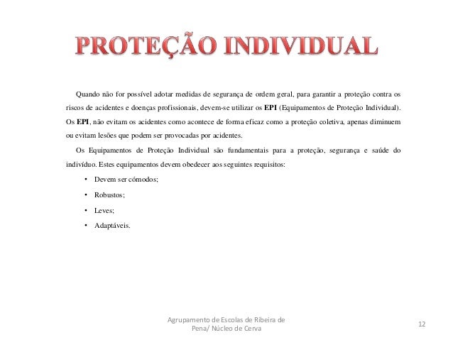 12. 12. Quando não for possível adotar medidas de segurança de ordem geral, para garantir a proteção contra osriscos de acidentes e doenças profissionais, devem-se utilizar os EPI (Equipamentos de Proteção Individual).Os EPI, não evitam os acidentes como acontece de forma eficaz como a proteção coletiva, apenas diminuemou evitam lesões que podem ser provocadas por acidentes. Os Equipamentos de Proteção Individual são fundamentais para a proteção, segurança e saúde doindivíduo. Estes equipamentos devem obedecer aos seguintes requisitos: • Devem ser cómodos; • Robustos; • Leves; • Adaptáveis. Agrupamento de Escolas de Ribeira de 12 Pena/ Núcleo de Cerva