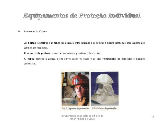 13. 13.  Protetores da Cabeça As boinas, os gorros e as redes são usadas contra sujidade e as poeiras e evitam também o enrolamento dos cabelos em máquinas. O capacete de proteção resiste ao impacto e à penetração de objetos. O capuz protege a cabeça e em certos casos os olhos e as vias respiratórias de partículas e líquidos corrosivos. Agrupamento de Escolas de Ribeira de 13 Pena/ Núcleo de Cerva