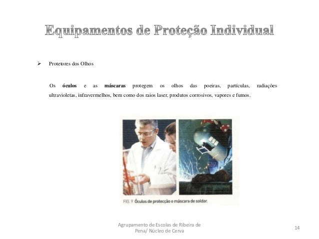14. 14.  Protetores dos Olhos Os óculos e as máscaras protegem os olhos das poeiras, partículas, radiações ultravioletas, infravermelhos, bem como dos raios laser, produtos corrosivos, vapores e fumos. Agrupamento de Escolas de Ribeira de 14 Pena/ Núcleo de Cerva