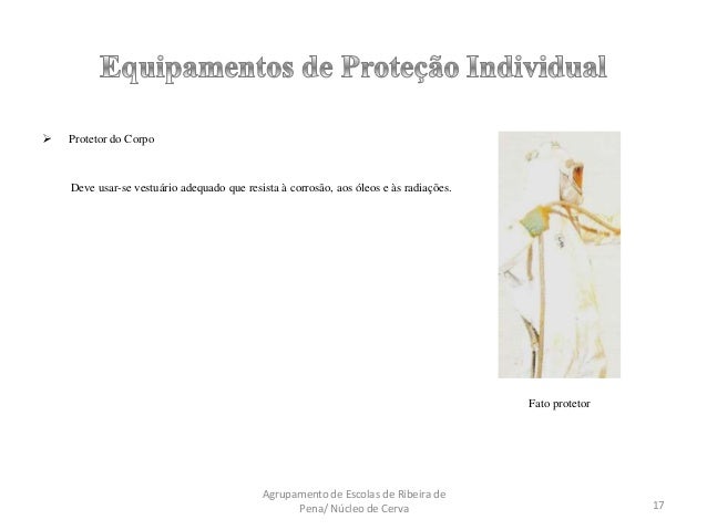 17. 17.  Protetor do Corpo Deve usar-se vestuário adequado que resista à corrosão, aos óleos e às radiações. Fato protetor Agrupamento de Escolas de Ribeira de Pena/ Núcleo de Cerva 17