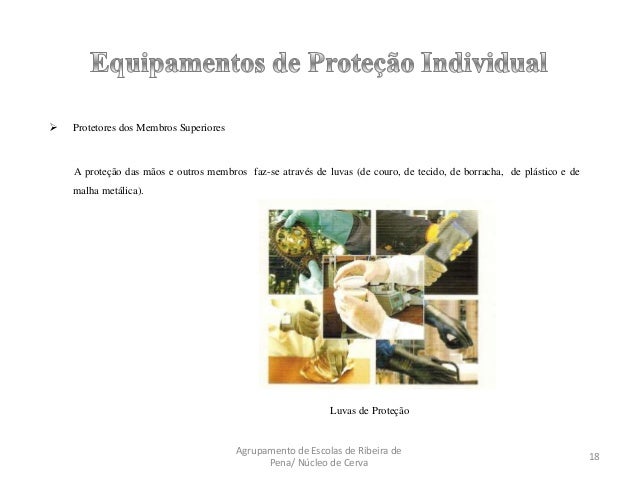 18. 18.  Protetores dos Membros Superiores A proteção das mãos e outros membros faz-se através de luvas (de couro, de tecido, de borracha, de plástico e de malha metálica). Luvas de Proteção Agrupamento de Escolas de Ribeira de 18 Pena/ Núcleo de Cerva
