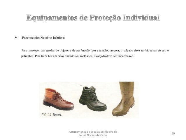 19. 19.  Protetores dos Membros Inferiores Para proteger das quedas de objetos e de perfuração (por exemplo, pregos), o calçado deve ter biqueiras de aço e palmilhas. Para trabalhar em pisos húmidos ou molhados, o calçado deve ser impermeável. Agrupamento de Escolas de Ribeira de 19 Pena/ Núcleo de Cerva