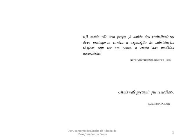 2. 2. «A saúde não tem preço. A saúde dos trabalhadores deve proteger-se contra a exposição às substâncias tóxicas sem ter em conta o custo das medidas necessárias. (SUPREMO TRIBUNAL DOS EUA, 1981). «Mais vale prevenir que remediar». (ADÁGIO POPULAR).Agrupamento de Escolas de Ribeira de 2 Pena/ Núcleo de Cerva