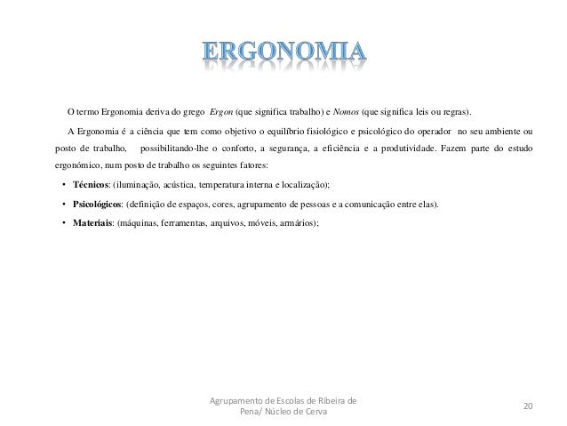 20. 20. O termo Ergonomia deriva do grego Ergon (que significa trabalho) e Nomos (que significa leis ou regras). A Ergonomia é a ciência que tem como objetivo o equilíbrio fisiológico e psicológico do operador no seu ambiente ouposto de trabalho, possibilitando-lhe o conforto, a segurança, a eficiência e a produtividade. Fazem parte do estudoergonómico, num posto de trabalho os seguintes fatores: • Técnicos: (iluminação, acústica, temperatura interna e localização); • Psicológicos: (definição de espaços, cores, agrupamento de pessoas e a comunicação entre elas). • Materiais: (máquinas, ferramentas, arquivos, móveis, armários); Agrupamento de Escolas de Ribeira de 20 Pena/ Núcleo de Cerva