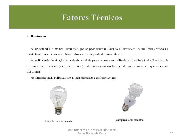 21. 21. • Iluminação A luz natural é a melhor iluminação que se pode usufruir. Quando a iluminação (natural e/ou artificial) éinsuficiente, pode provocar acidentes, danos visuais e perda de produtividade. A qualidade da iluminação depende da atividade para que está a ser utilizada, da distribuição das lâmpadas, daharmonia entre as cores (da luz e do local) e do encandeamento (reflexo de luz na superfície que está a sertrabalhada). As lâmpadas mais utilizadas são as incandescentes e as fluorescentes Lâmpada Incandescente Lâmpada Fluorescente Agrupamento de Escolas de Ribeira de 21 Pena/ Núcleo de Cerva