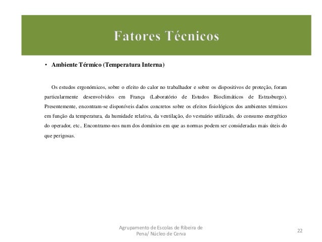 22. 22. • Ambiente Térmico (Temperatura Interna) Os estudos ergonómicos, sobre o efeito do calor no trabalhador e sobre os dispositivos de proteção, foramparticularmente desenvolvidos em França (Laboratório de Estudos Bioclimáticos de Estrasburgo).Presentemente, encontram-se disponíveis dados concretos sobre os efeitos fisiológicos dos ambientes térmicosem função da temperatura, da humidade relativa, da ventilação, do vestuário utilizado, do consumo energéticodo operador, etc.. Encontramo-nos num dos domínios em que as normas podem ser consideradas mais úteis doque perigosas. Agrupamento de Escolas de Ribeira de 22 Pena/ Núcleo de Cerva
