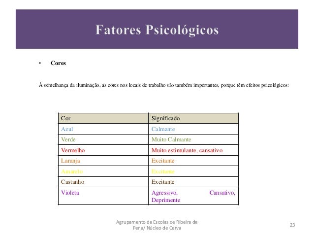 23. 23. • CoresÀ semelhança da iluminação, as cores nos locais de trabalho são também importantes, porque têm efeitos psicológicos: Cor Significado Azul Calmante Verde Muito Calmante Vermelho Muito estimulante, cansativo Laranja Excitante Amarelo Excitante Castanho Excitante Violeta Agressivo, Cansativo, Deprimente Agrupamento de Escolas de Ribeira de 23 Pena/ Núcleo de Cerva