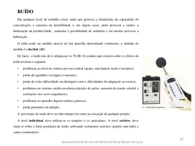 24. 24. RUÍDO Em qualquer local de trabalho existe ruido que provoca a diminuição da capacidade deconcentração, o aumento da irritabilidade e, em alguns casos, pode provocar a surdez, adiminuição da produtividade , aumentar a possibilidade de acidentes e até mesmo provocar ahabituação. O ruído pode ser medido através de um aparelho denominado sonómetro; a unidade demedida é o decibel (dB). De facto, o ruído não deve ultrapassar os 70 dB. Os estudos que existem sobre os efeitos doruído revelam o seguinte: • problemas ao nível do sistema nervoso central (apatia, mau humor, medo e insónias); • perda de equilíbrio (vertigens e náuseas); • perda de visão (dificuldade em distinguir cores e dificuldades de adaptação ao escuro); • problemas no sistema cardiovascular(aceleração do pulso, aumento da tensão arterial e contrações nos vasos sanguíneos); • problemas no aparelho digestivo(dores gástrica); • perda prematura da audição. A prevenção do ruído deve ser tida sempre em conta na conceção de qualquer projeto. A nível individual, deve utilizar-se os tampões e os auriculares. A nível coletivo, deveatuar-se sobre a fonte produtora de ruído, utilizando isolamento acústico (painéis anti-ruído eoutros isolamentos) 24 Agrupamento de Escolas de Ribeira de Pena/ Núcleo de Cerva