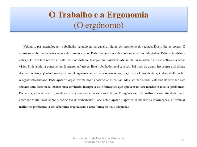 25. 25. O Trabalho e a Ergonomia (O ergónomo) Vejamos, por exemplo, um trabalhador sentado numa cadeira, diante do monitor e do teclado. Doem-lhe as costas. Oergónomo sabe muita coisa acerca das nossas costas. Pode ajudar a conceber assentos melhor adaptados. Dói-lhe também acabeça. O ecrã tem reflexos e está mal contrastado. O ergónomo também sabe muita coisa sobre os nossos olhos e a nossavisão. Pode ajudar a conceber ecrãs menos refletores. Este trabalhador está cansado. Há mais de quatro horas que está diantedo seu monitor, e já não é muito jovem. O ergónomo sabe imensas coisas em relação aos efeitos da duração do trabalho sobreo organismo humano. Pode ajudar a organizar melhor os horários e as pausas. Mas isto não é tudo: este trabalhador não estásentado sem fazer nada; exerce uma atividade. Interpreta as informações que aprecem no seu monitor e resolve problemas.Por vezes, comete erros e, muitas vezes, comunica com os seus colegas. O ergónomo, pela análise da sua atividade, podeaprender muita coisa sobre o raciocínio do trabalhador. Pode então ajudar a apresentar melhor as informações, a formularmelhor os problemas, a conceber uma organização e uma formação mais adaptadas. Agrupamento de Escolas de Ribeira de 25 Pena/ Núcleo de Cerva