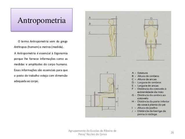 26. 26. Antropometria O termo Antropometria vem do gregoAnthropos (homem) e metros (medida).A Antropometria é essencial à Ergonomiaporque lhe fornece informações como asmedidas e amplitudes do corpo humano.Essas informações são essenciais para queo posto de trabalho esteja com dimensãoadequada ao corpo. Agrupamento de Escolas de Ribeira de 26 Pena/ Núcleo de Cerva