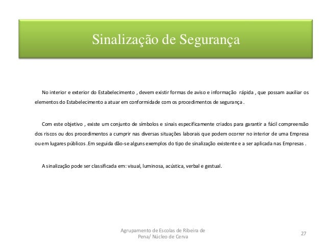 27. 27. Sinalização de Segurança No interior e exterior do Estabelecimento , devem existir formas de aviso e informação rápida , que possam auxiliar oselementos do Estabelecimento a atuar em conformidade com os procedimentos de segurança . Com este objetivo , existe um conjunto de símbolos e sinais especificamente criados para garantir a fácil compreensãodos riscos ou dos procedimentos a cumprir nas diversas situações laborais que podem ocorrer no interior de uma Empresaou em lugares públicos .Em seguida dão-se alguns exemplos do tipo de sinalização existente e a ser aplicada nas Empresas . A sinalização pode ser classificada em: visual, luminosa, acústica, verbal e gestual. Agrupamento de Escolas de Ribeira de 27 Pena/ Núcleo de Cerva