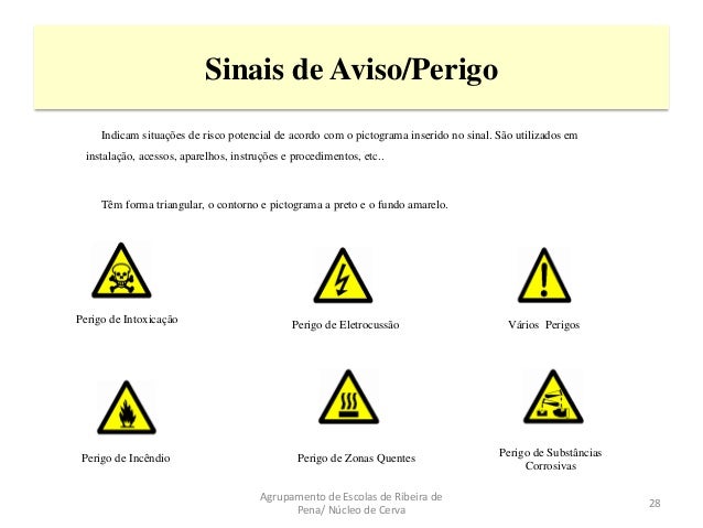28. 28. Sinais de Aviso/Perigo Indicam situações de risco potencial de acordo com o pictograma inserido no sinal. São utilizados em instalação, acessos, aparelhos, instruções e procedimentos, etc.. Têm forma triangular, o contorno e pictograma a preto e o fundo amarelo.Perigo de Intoxicação Perigo de Eletrocussão Vários Perigos Perigo de Incêndio Perigo de Zonas Quentes Perigo de Substâncias Corrosivas Agrupamento de Escolas de Ribeira de 28 Pena/ Núcleo de Cerva