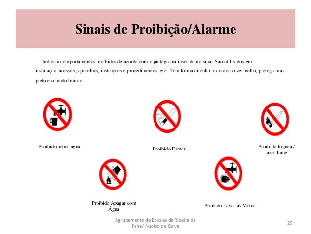 29. 29. Sinais de Proibição/Alarme Indicam comportamentos proibidos de acordo com o pictograma inserido no sinal. São utilizados eminstalação, acessos , aparelhos, instruções e procedimentos, etc.. Têm forma circular, o contorno vermelho, pictograma apreto e o fundo branco. Proibido beber água Proibido Fumar Proibido foguear/ fazer lume. Proibido Apagar com Proibido Lavar as Mãos Água Agrupamento de Escolas de Ribeira de 29 Pena/ Núcleo de Cerva