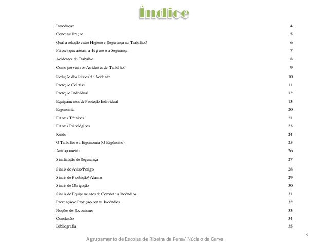 3. 3. Introdução 4Concetualização 5Qual a relação entre Higiene e Segurança no Trabalho? 6Fatores que afetam a Higiene e a Segurança 7Acidentes de Trabalho 8Como prevenir os Acidentes de Trabalho? 9Redução dos Riscos de Acidente 10Proteção Coletiva 11Proteção Individual 12Equipamentos de Proteção Individual 13Ergonomia 20Fatores Técnicos 21Fatores Psicológicos 23Ruído 24O Trabalho e a Ergonomia (O Ergónomo) 25Antropometria 26Sinalização de Segurança 27Sinais de Aviso/Perigo 28Sinais de Proibição/ Alarme 29Sinais de Obrigação 30Sinais de Equipamentos de Combate a Incêndios 31Prevenção e Proteção contra Incêndios 32Noções de Socorrismo 33Conclusão 34Bibliografia 35 3 Agrupamento de Escolas de Ribeira de Pena/ Núcleo de Cerva