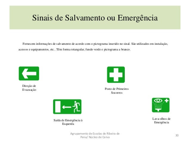 30. 30. Sinais de Salvamento ou Emergência Fornecem informações de salvamento de acordo com o pictograma inserido no sinal. São utilizados em instalação,acessos e equipamentos, etc.. Têm forma retangular, fundo verde e pictograma a branco. Direção de Evacuação Posto de Primeiros Socorros Saída de Emergência à Lava-olhos de Esquerda Emergência Agrupamento de Escolas de Ribeira de 30 Pena/ Núcleo de Cerva