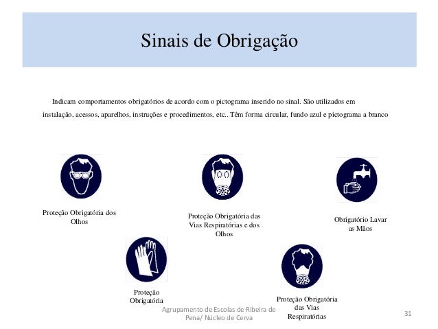 31. 31. Sinais de Obrigação Indicam comportamentos obrigatórios de acordo com o pictograma inserido no sinal. São utilizados eminstalação, acessos, aparelhos, instruções e procedimentos, etc.. Têm forma circular, fundo azul e pictograma a brancoProteção Obrigatória dos Proteção Obrigatória das Olhos Obrigatório Lavar Vias Respiratórias e dos as Mãos Olhos Proteção Obrigatória Proteção Obrigatória Agrupamento de Escolas de Ribeira de das Vias Respiratórias 31 Pena/ Núcleo de Cerva