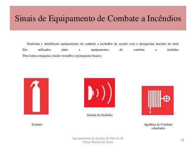 32. 32. Sinais de Equipamento de Combate a Incêndios Sinalizam e identificam equipamentos de combate a incêndios de acordo com o pictograma inserido no sinal. São utilizados junto a equipamentos de combate a incêndio. Têm forma retangular, fundo vermelho e pictograma branco. Alarme de Incêndio Extintor Agulheta de Combate a Incêndio Agrupamento de Escolas de Ribeira de 32 Pena/ Núcleo de Cerva