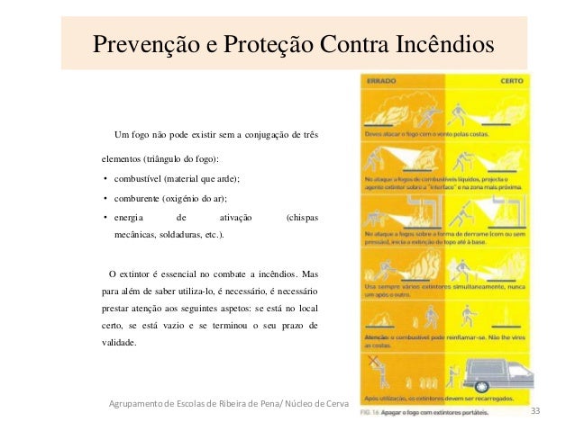 33. 33. Prevenção e Proteção Contra Incêndios Um fogo não pode existir sem a conjugação de trêselementos (triângulo do fogo):• combustível (material que arde);• comburente (oxigénio do ar);• energia de ativação (chispas mecânicas, soldaduras, etc.). O extintor é essencial no combate a incêndios. Maspara além de saber utiliza-lo, é necessário, é necessárioprestar atenção aos seguintes aspetos: se está no localcerto, se está vazio e se terminou o seu prazo devalidade. Agrupamento de Escolas de Ribeira de Pena/ Núcleo de Cerva 33