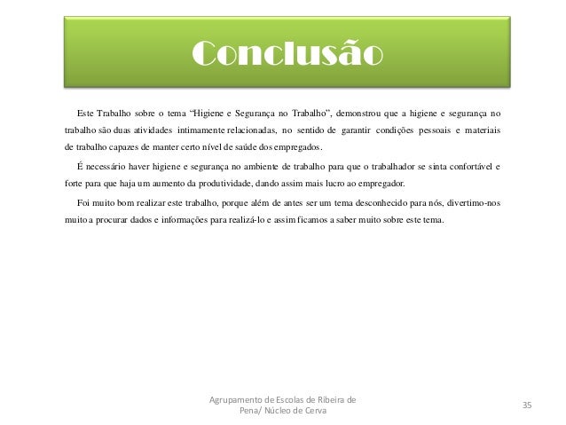 Conclusão   Este Trabalho sobre o tema “Higiene e Segurança no Trabalho”, demonstrou que a higiene e segurança notrabalho ...