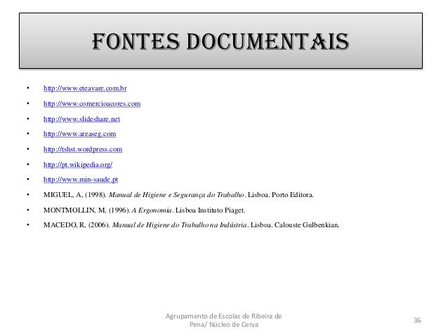 36. 36. Fontes Documentais• http://www.eteavare.com.br• http://www.comercioacores.com• http://www.slideshare.net• http://www.areaseg.com• http://tshst.wordpress.com• http://pt.wikipedia.org/• http://www.min-saude.pt• MIGUEL, A, (1998). Manual de Higiene e Segurança do Trabalho. Lisboa. Porto Editora.• MONTMOLLIN, M, (1996). A Ergonomia. Lisboa Instituto Piaget.• MACEDO, R, (2006). Manual de Higiene do Trabalho na Indústria. Lisboa. Calouste Gulbenkian. Agrupamento de Escolas de Ribeira de 36 Pena/ Núcleo de Cerva
