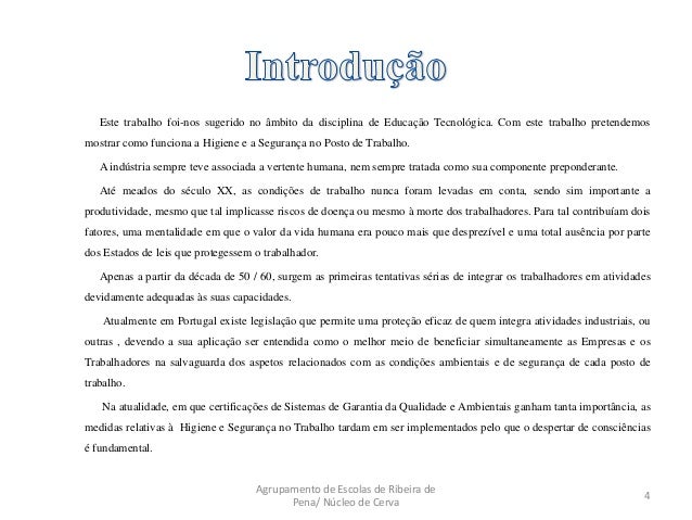 4. 4. Este trabalho foi-nos sugerido no âmbito da disciplina de Educação Tecnológica. Com este trabalho pretendemosmostrar como funciona a Higiene e a Segurança no Posto de Trabalho. A indústria sempre teve associada a vertente humana, nem sempre tratada como sua componente preponderante. Até meados do século XX, as condições de trabalho nunca foram levadas em conta, sendo sim importante aprodutividade, mesmo que tal implicasse riscos de doença ou mesmo à morte dos trabalhadores. Para tal contribuíam doisfatores, uma mentalidade em que o valor da vida humana era pouco mais que desprezível e uma total ausência por partedos Estados de leis que protegessem o trabalhador. Apenas a partir da década de 50 / 60, surgem as primeiras tentativas sérias de integrar os trabalhadores em atividadesdevidamente adequadas às suas capacidades. Atualmente em Portugal existe legislação que permite uma proteção eficaz de quem integra atividades industriais, ououtras , devendo a sua aplicação ser entendida como o melhor meio de beneficiar simultaneamente as Empresas e osTrabalhadores na salvaguarda dos aspetos relacionados com as condições ambientais e de segurança de cada posto detrabalho. Na atualidade, em que certificações de Sistemas de Garantia da Qualidade e Ambientais ganham tanta importância, asmedidas relativas à Higiene e Segurança no Trabalho tardam em ser implementados pelo que o despertar de consciênciasé fundamental. Agrupamento de Escolas de Ribeira de 4 Pena/ Núcleo de Cerva