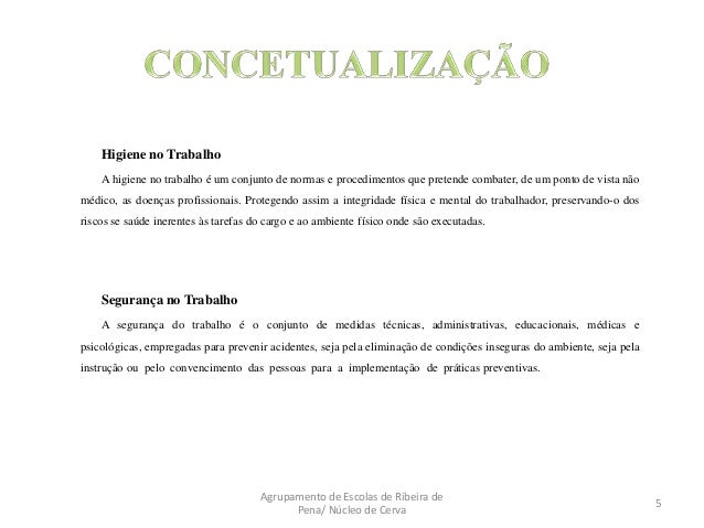 5. 5. Higiene no Trabalho A higiene no trabalho é um conjunto de normas e procedimentos que pretende combater, de um ponto de vista nãomédico, as doenças profissionais. Protegendo assim a integridade física e mental do trabalhador, preservando-o dosriscos se saúde inerentes às tarefas do cargo e ao ambiente físico onde são executadas. Segurança no Trabalho A segurança do trabalho é o conjunto de medidas técnicas, administrativas, educacionais, médicas epsicológicas, empregadas para prevenir acidentes, seja pela eliminação de condições inseguras do ambiente, seja pelainstrução ou pelo convencimento das pessoas para a implementação de práticas preventivas. Agrupamento de Escolas de Ribeira de 5 Pena/ Núcleo de Cerva