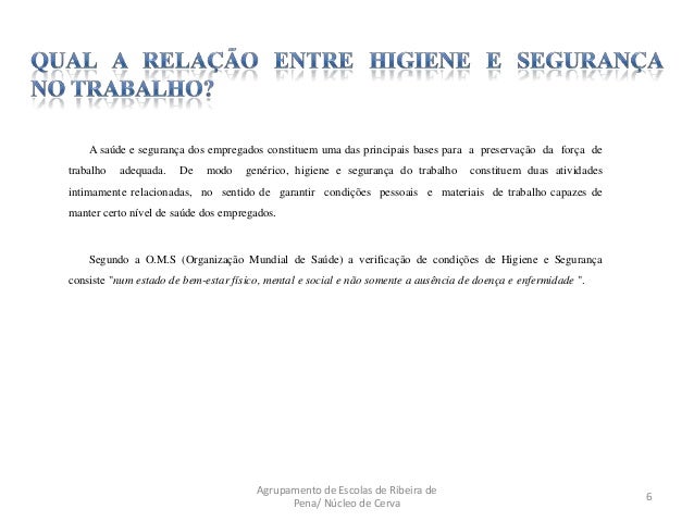 6. 6. A saúde e segurança dos empregados constituem uma das principais bases para a preservação da força detrabalho adequada. De modo genérico, higiene e segurança do trabalho constituem duas atividadesintimamente relacionadas, no sentido de garantir condições pessoais e materiais de trabalho capazes demanter certo nível de saúde dos empregados. Segundo a O.M.S (Organização Mundial de Saúde) a verificação de condições de Higiene e Segurançaconsiste "num estado de bem-estar físico, mental e social e não somente a ausência de doença e enfermidade ". Agrupamento de Escolas de Ribeira de 6 Pena/ Núcleo de Cerva