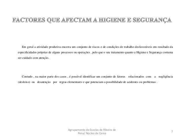7. 7. Em geral a atividade produtiva encerra um conjunto de riscos e de condições de trabalho desfavoráveis em resultado daespecificidades próprias de alguns processos ou operações , pelo que o seu tratamento quanto a Higiene e Segurança costumaser cuidado com atenção. Contudo , na maior parte dos casos , é possível identificar um conjunto de fatores relacionados com a negligência(desleixo) ou desatenção por regras elementares e que potenciam a possibilidade de acidentes ou problemas . Agrupamento de Escolas de Ribeira de 7 Pena/ Núcleo de Cerva