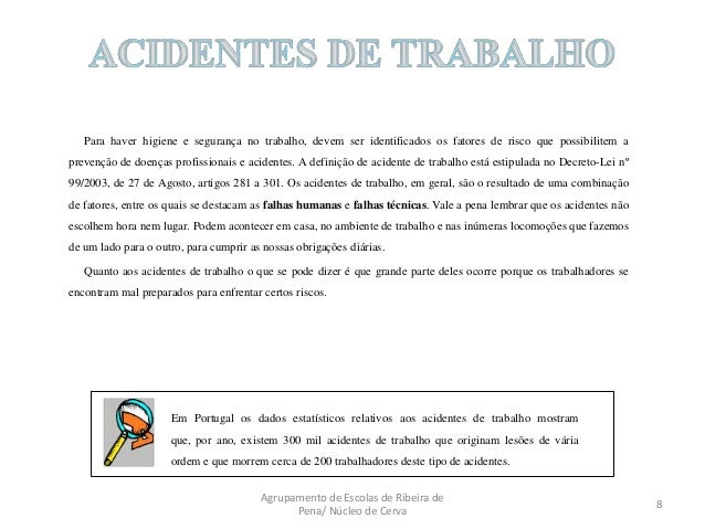 8. 8. Para haver higiene e segurança no trabalho, devem ser identificados os fatores de risco que possibilitem aprevenção de doenças profissionais e acidentes. A definição de acidente de trabalho está estipulada no Decreto-Lei nº99/2003, de 27 de Agosto, artigos 281 a 301. Os acidentes de trabalho, em geral, são o resultado de uma combinaçãode fatores, entre os quais se destacam as falhas humanas e falhas técnicas. Vale a pena lembrar que os acidentes nãoescolhem hora nem lugar. Podem acontecer em casa, no ambiente de trabalho e nas inúmeras locomoções que fazemosde um lado para o outro, para cumprir as nossas obrigações diárias. Quanto aos acidentes de trabalho o que se pode dizer é que grande parte deles ocorre porque os trabalhadores seencontram mal preparados para enfrentar certos riscos. Em Portugal os dados estatísticos relativos aos acidentes de trabalho mostram que, por ano, existem 300 mil acidentes de trabalho que originam lesões de vária ordem e que morrem cerca de 200 trabalhadores deste tipo de acidentes. Agrupamento de Escolas de Ribeira de 8 Pena/ Núcleo de Cerva