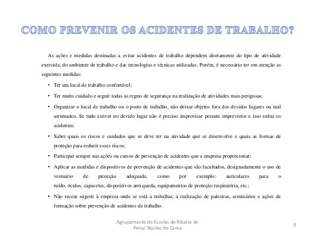 9. 9. As ações e medidas destinadas a evitar acidentes de trabalho dependem diretamente do tipo de atividadeexercida, do ambiente de trabalho e das tecnologias e técnicas utilizadas. Porém, é necessário ter em atenção asseguintes medidas: • Ter um local de trabalho confortável; • Ter muito cuidado e seguir todas as regras de segurança na realização de atividades mais perigosas; • Organizar o local de trabalho ou o posto de trabalho, não deixar objetos fora dos devidos lugares ou mal arrumados. Se tudo estiver no devido lugar não é preciso improvisar perante imprevistos e isso reduz os acidentes; • Saber quais os riscos e cuidados que se deve ter na atividade que se desenvolve e quais as formas de proteção para reduzir esses riscos; • Participar sempre nas ações ou cursos de prevenção de acidentes que a empresa proporcionar; • Aplicar as medidas e dispositivos de prevenção de acidentes que são facultados, designadamente o uso de vestuário de proteção adequado, como por exemplo: auriculares para o ruído, óculos, capacetes, dispositivos anti queda, equipamentos de proteção respiratória, etc.; • Não recear sugerir à empresa onde se está a trabalhar, a realização de palestras, seminários e ações de formação sobre prevenção de acidentes de trabalho. Agrupamento de Escolas de Ribeira de 9 Pena/ Núcleo de Cerva