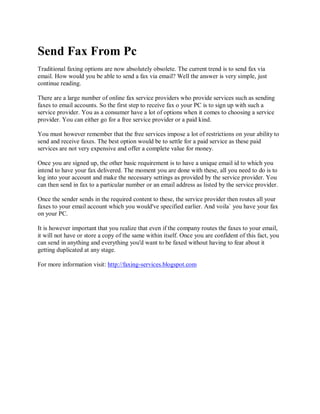1. 1. Send Fax From Pc Traditional faxing options are now absolutely obsolete. The current trend is to send fax via email. How would you be able to send a fax via email? Well the answer is very simple, just continue reading. There are a large number of online fax service providers who provide services such as sending faxes to email accounts. So the first step to receive fax o your PC is to sign up with such a service provider. You as a consumer have a lot of options when it comes to choosing a service provider. You can either go for a free service provider or a paid kind. You must however remember that the free services impose a lot of restrictions on your ability to send and receive faxes. The best option would be to settle for a paid service as these paid services are not very expensive and offer a complete value for money. Once you are signed up, the other basic requirement is to have a unique email id to which you intend to have your fax delivered. The moment you are done with these, all you need to do is to log into your account and make the necessary settings as provided by the service provider. You can then send in fax to a particular number or an email address as listed by the service provider. Once the sender sends in the required content to these, the service provider then routes all your faxes to your email account which you would've specified earlier. And voila` you have your fax on your PC. It is however important that you realize that even if the company routes the faxes to your email, it will not have or store a copy of the same within itself. Once you are confident of this fact, you can send in anything and everything you'd want to be faxed without having to fear about it getting duplicated at any stage. For more information visit: http://faxing-services.blogspot.com