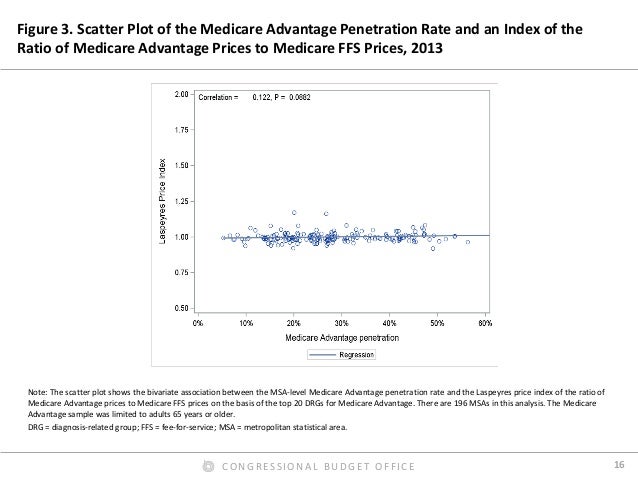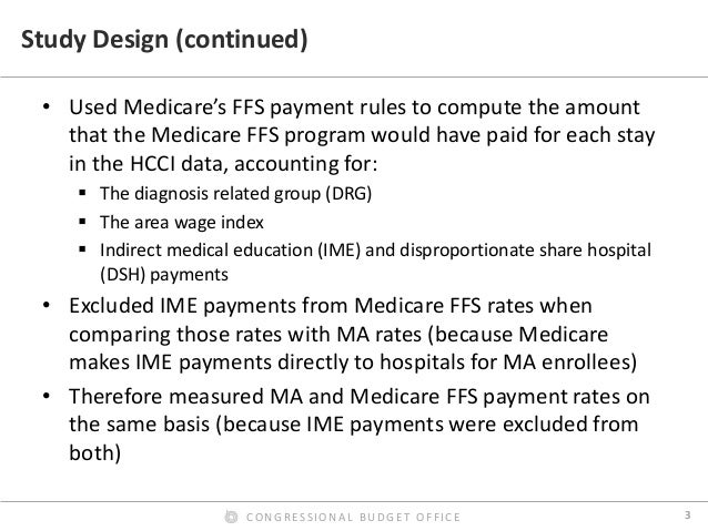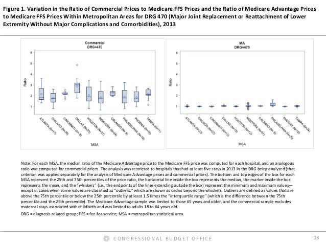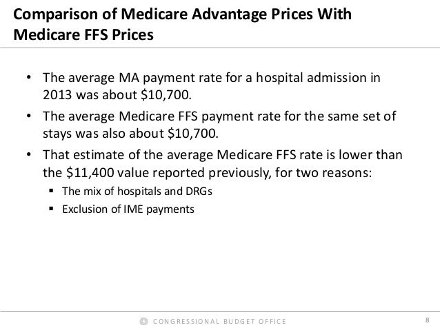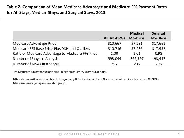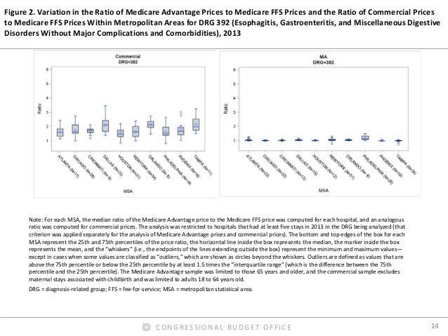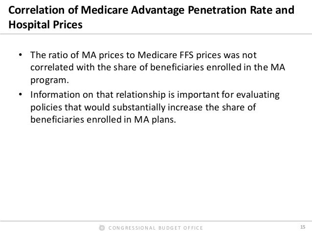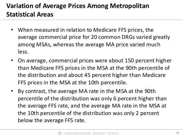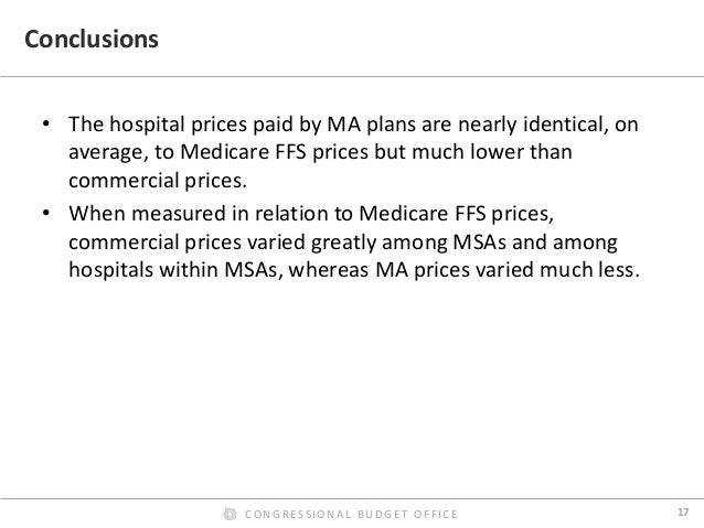 By contrast, we found that Medicare Advantage rates for hospital inpatient services were roughly equal to Medicare’s FFS rates, on average. In our preferred comparison, we excluded Medicare’s additional payments for admissions to teaching hospitals from the FFS rates, because the Medicare program makes such payments directly to hospitals for Medicare Advantage enrollees. Those additional payments were thus excluded from our estimated payment rates for both FFS and Medicare Advantage. But including those additional payments in the FFS rates affected the comparison only modestly. We also found that the ratio of Medicare Advantage rates to Medicare’s FFS rates varied much less across hospital stays, across metropolitan areas, and across hospitals within metropolitan areas than the corresponding ratio for commercial rates. Finally, we found that hospital payment rates in Medicare Advantage plans do not increase or decrease noticeably as the share of enrollees in those plans grows—a finding that has informed the Congressional Budget Office’s analysis of proposals to change the terms of competition between Medicare Advantage plans and Medicare’s FFS program.