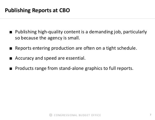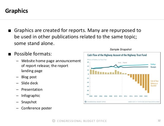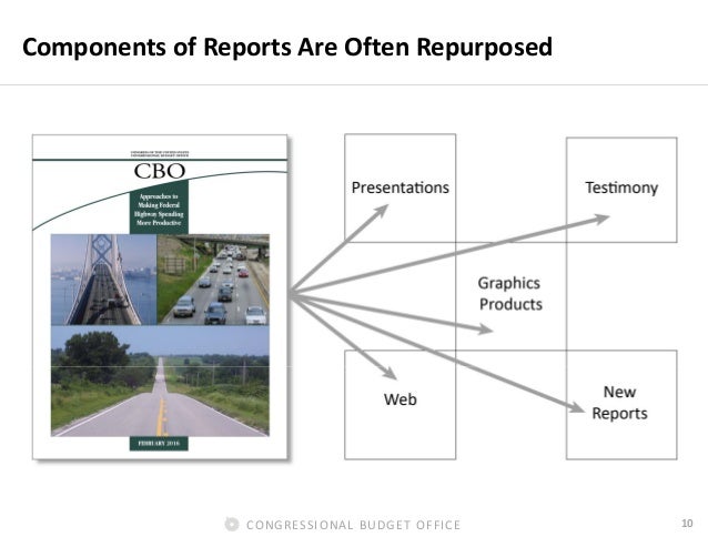 This presentation provides an overview of the visual communications initiatives at CBO. It illustrates the evolution of graphics products at the agency, and some of the best practices that it has adopted for those products.