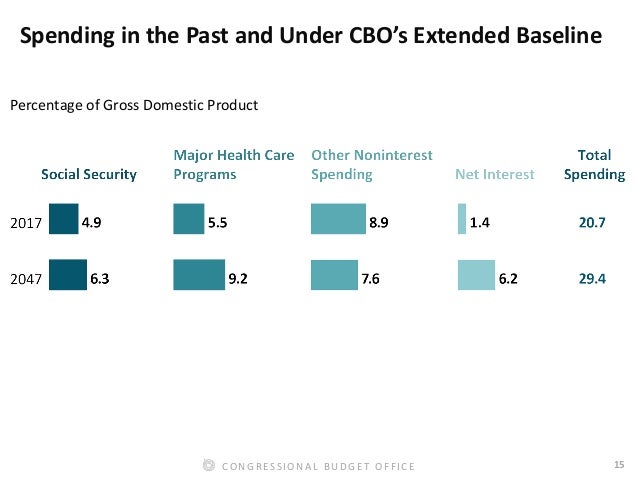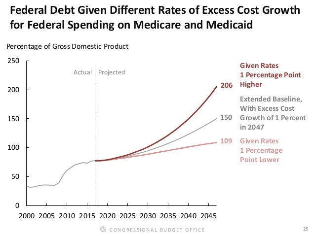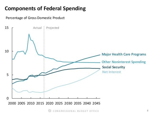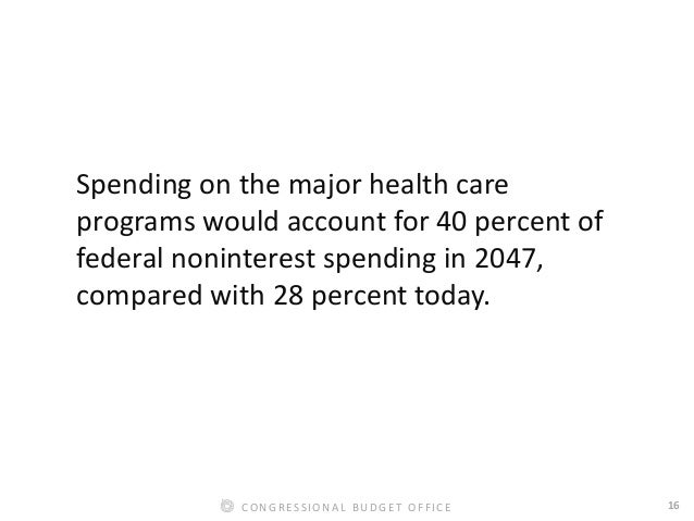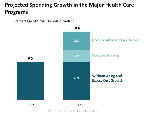 CBO projects that federal spending on the major health care programs would grow larger than spending in any other category if current laws generally remained unchanged. Driven particularly by growth in Medicare outlays, spending on those programs would account for 40 percent of federal noninterest spending in 2047, compared with 28 percent today. Two factors explain the projected growth in spending on major health care programs: aging of the population and rising health care costs per person (that is, excess cost growth).