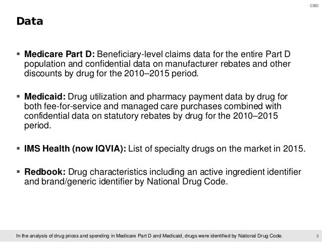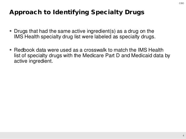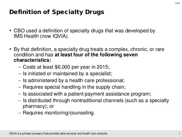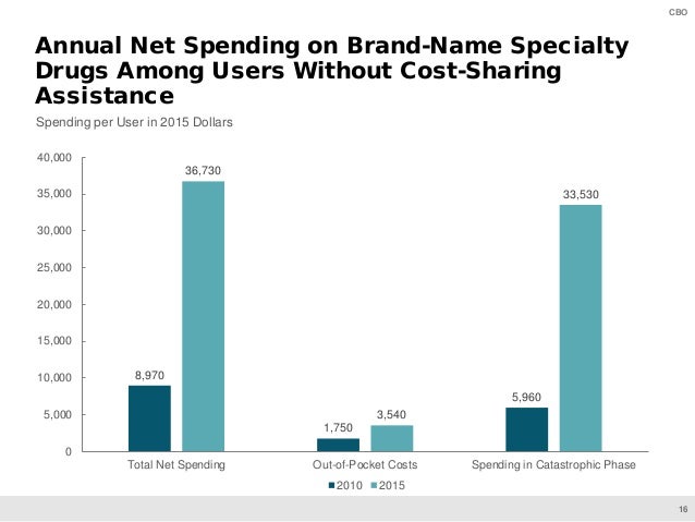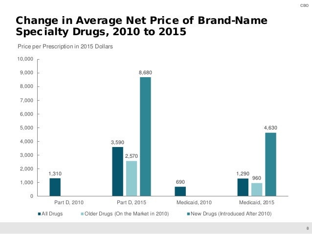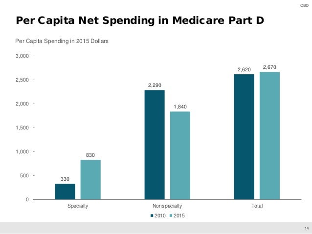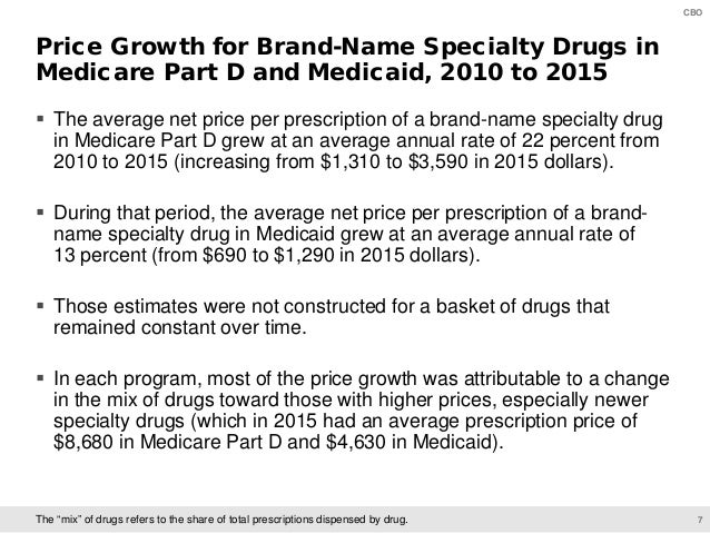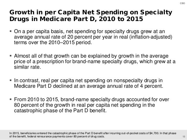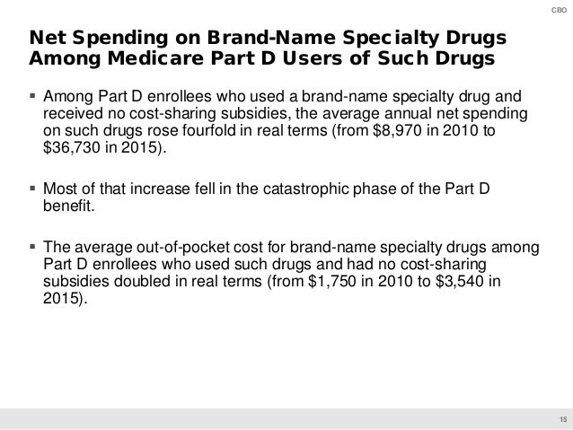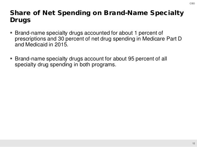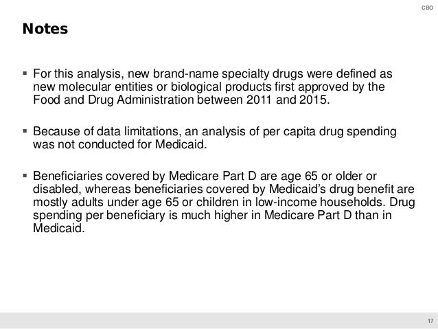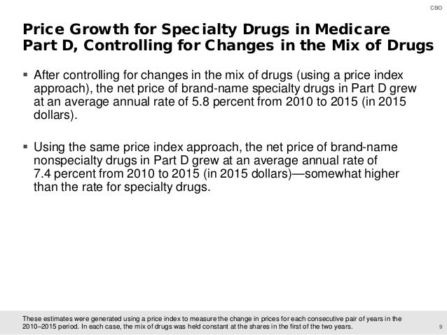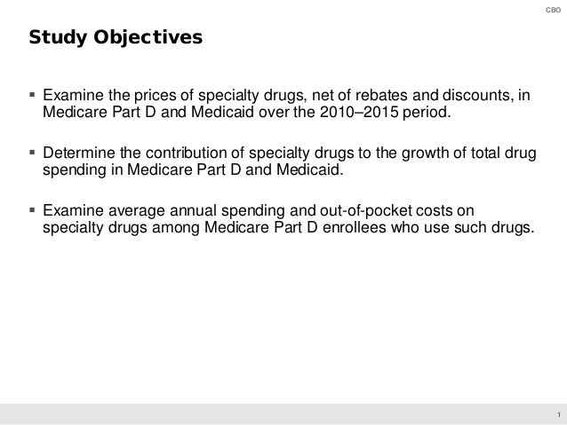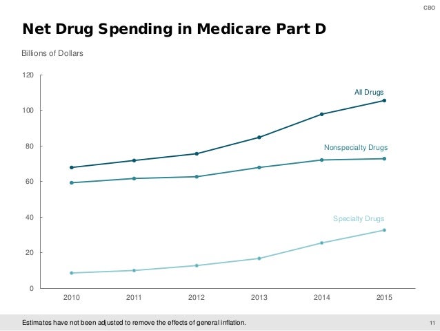 On June 11, CBO will present preliminary findings of a study of specialty drugs to be released by the agency later this year. The presentation provides information on the prices for specialty drugs, net of rebates and discounts, in Medicare Part D and Medicaid over the 2010–2015 period; the increase in net spending on specialty drugs in each program; and total net spending and out-of-pocket costs for specialty drugs among Medicare Part D enrollees who use such drugs.