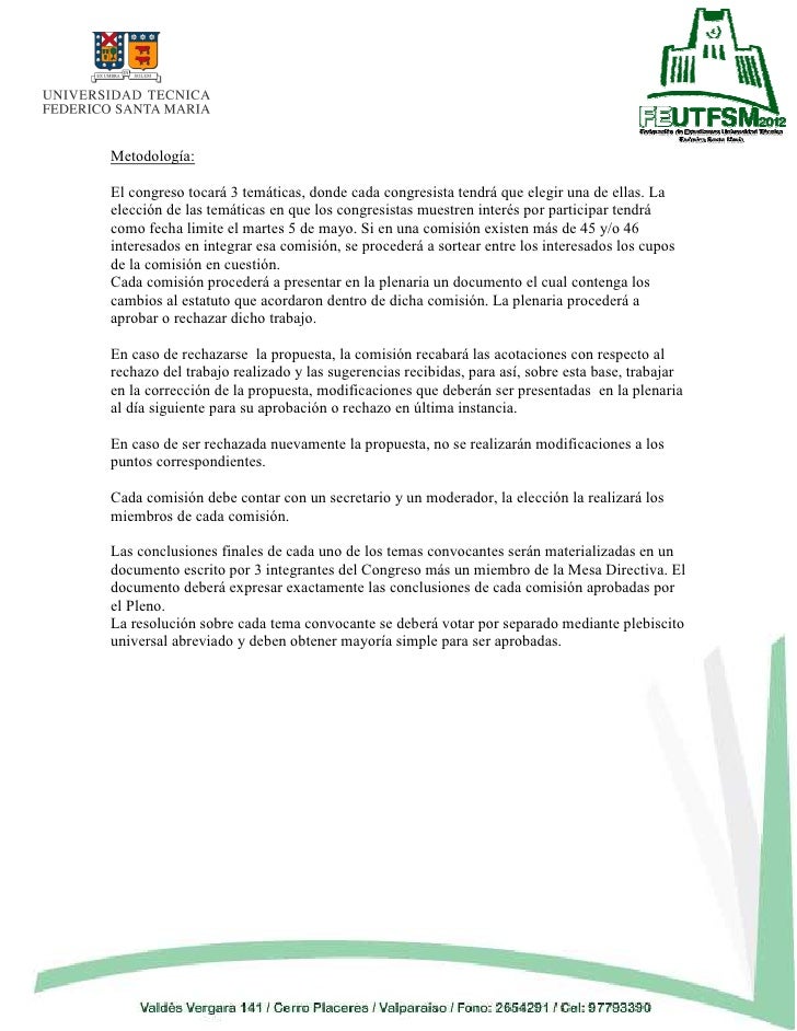 2. 2. Metodología:El congreso tocará 3 temáticas, donde cada congresista tendrá que elegir una de ellas. Laelección de las temáticas en que los congresistas muestren interés por participar tendrácomo fecha limite el martes 5 de mayo. Si en una comisión existen más de 45 y/o 46interesados en integrar esa comisión, se procederá a sortear entre los interesados los cuposde la comisión en cuestión.Cada comisión procederá a presentar en la plenaria un documento el cual contenga loscambios al estatuto que acordaron dentro de dicha comisión. La plenaria procederá aaprobar o rechazar dicho trabajo.En caso de rechazarse la propuesta, la comisión recabará las acotaciones con respecto alrechazo del trabajo realizado y las sugerencias recibidas, para así, sobre esta base, trabajaren la corrección de la propuesta, modificaciones que deberán ser presentadas en la plenariaal día siguiente para su aprobación o rechazo en última instancia.En caso de ser rechazada nuevamente la propuesta, no se realizarán modificaciones a lospuntos correspondientes.Cada comisión debe contar con un secretario y un moderador, la elección la realizará losmiembros de cada comisión.Las conclusiones finales de cada uno de los temas convocantes serán materializadas en undocumento escrito por 3 integrantes del Congreso más un miembro de la Mesa Directiva. Eldocumento deberá expresar exactamente las conclusiones de cada comisión aprobadas porel Pleno.La resolución sobre cada tema convocante se deberá votar por separado mediante plebiscitouniversal abreviado y deben obtener mayoría simple para ser aprobadas.