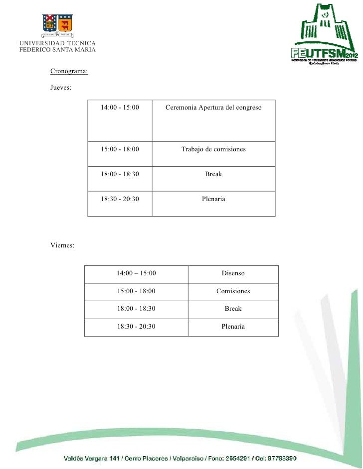 3. 3. Cronograma:Jueves: 14:00 - 15:00 Ceremonia Apertura del congreso 15:00 - 18:00 Trabajo de comisiones 18:00 - 18:30 Break 18:30 - 20:30 PlenariaViernes: 14:00 – 15:00 Disenso 15:00 - 18:00 Comisiones 18:00 - 18:30 Break 18:30 - 20:30 Plenaria