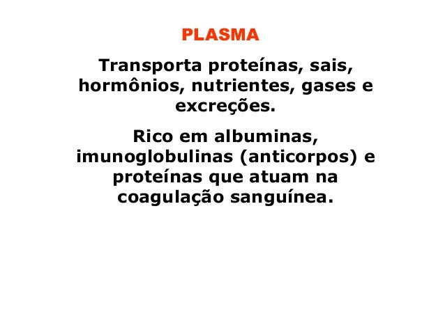 87. 87. PLASMA Transporta proteínas, sais,hormônios, nutrientes, gases e excreções. Rico em albuminas,imunoglobulinas (anticorpos) e proteínas que atuam na coagulação sanguínea.
