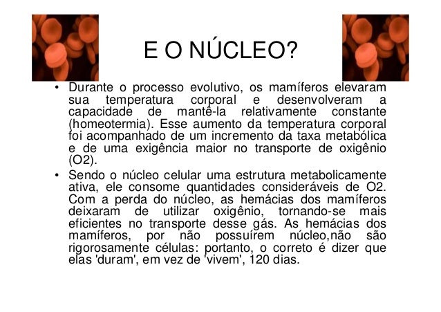 89. 89. E O NÚCLEO?• Durante o processo evolutivo, os mamíferos elevaram sua temperatura corporal e desenvolveram a capacidade de mantê-la relativamente constante (homeotermia). Esse aumento da temperatura corporal foi acompanhado de um incremento da taxa metabólica e de uma exigência maior no transporte de oxigênio (O2).• Sendo o núcleo celular uma estrutura metabolicamente ativa, ele consome quantidades consideráveis de O2. Com a perda do núcleo, as hemácias dos mamíferos deixaram de utilizar oxigênio, tornando-se mais eficientes no transporte desse gás. As hemácias dos mamíferos, por não possuírem núcleo,não são rigorosamente células: portanto, o correto é dizer que elas duram, em vez de vivem, 120 dias.