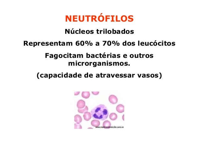 93. 93. NEUTRÓFILOS Núcleos trilobadosRepresentam 60% a 70% dos leucócitos Fagocitam bactérias e outros microrganismos. (capacidade de atravessar vasos)