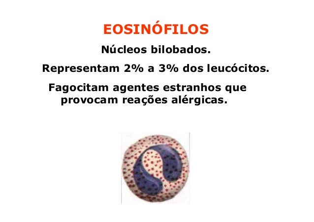 94. 94. EOSINÓFILOS Núcleos bilobados.Representam 2% a 3% dos leucócitos.Fagocitam agentes estranhos que provocam reações alérgicas. toxinas