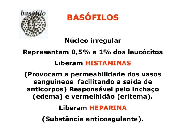 95. 95. BASÓFILOS Núcleo irregularRepresentam 0,5% a 1% dos leucócitos Liberam HISTAMINAS(Provocam a permeabilidade dos vasos sanguíneos facilitando a saída de anticorpos) Responsável pelo inchaço (edema) e vermelhidão (eritema). Liberam HEPARINA (Substância anticoagulante).